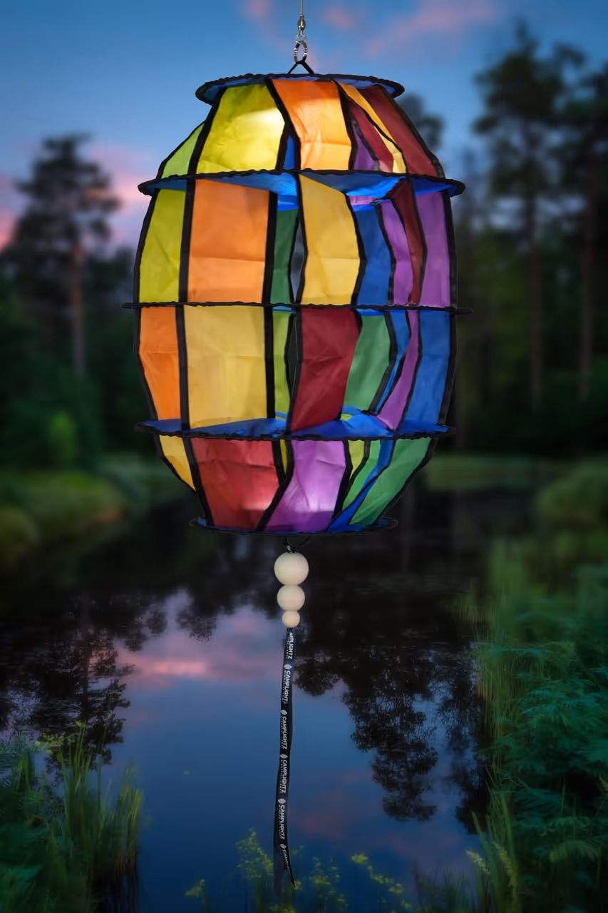 Hänge die farbenfrohe Lampe beispielsweise an die Markise deines Fahrzeuges oder in einen nahe gelegenen Baum. Der besondere Zaubereffekt entfaltet sich jedoch am besten durch das Verwenden, der im Video gezeigten Federrute.